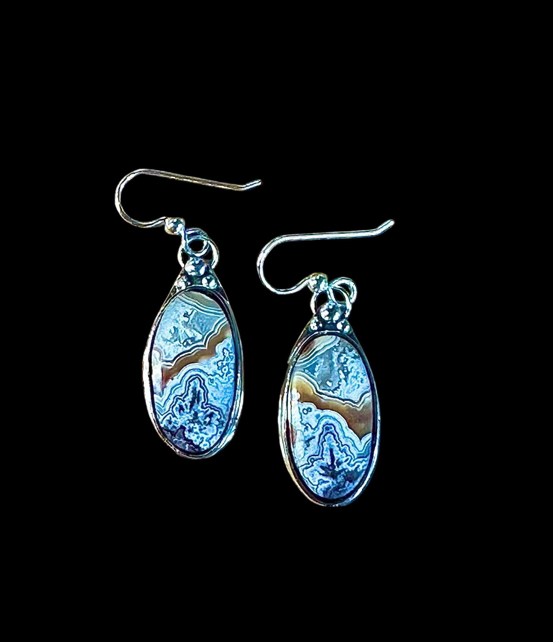 A pair of beautiful perfectly matched Crazy Lace Agate cabochons cut by our lapidary artist Paul Rossman . These quality cabochons features a range of colors and beautiful pattern . Earrings are set in sterling and fine silver and measure 1 1/2” to the top of the ear wire . Quality stones in artisan settings set our jewelry apart from the crowd .