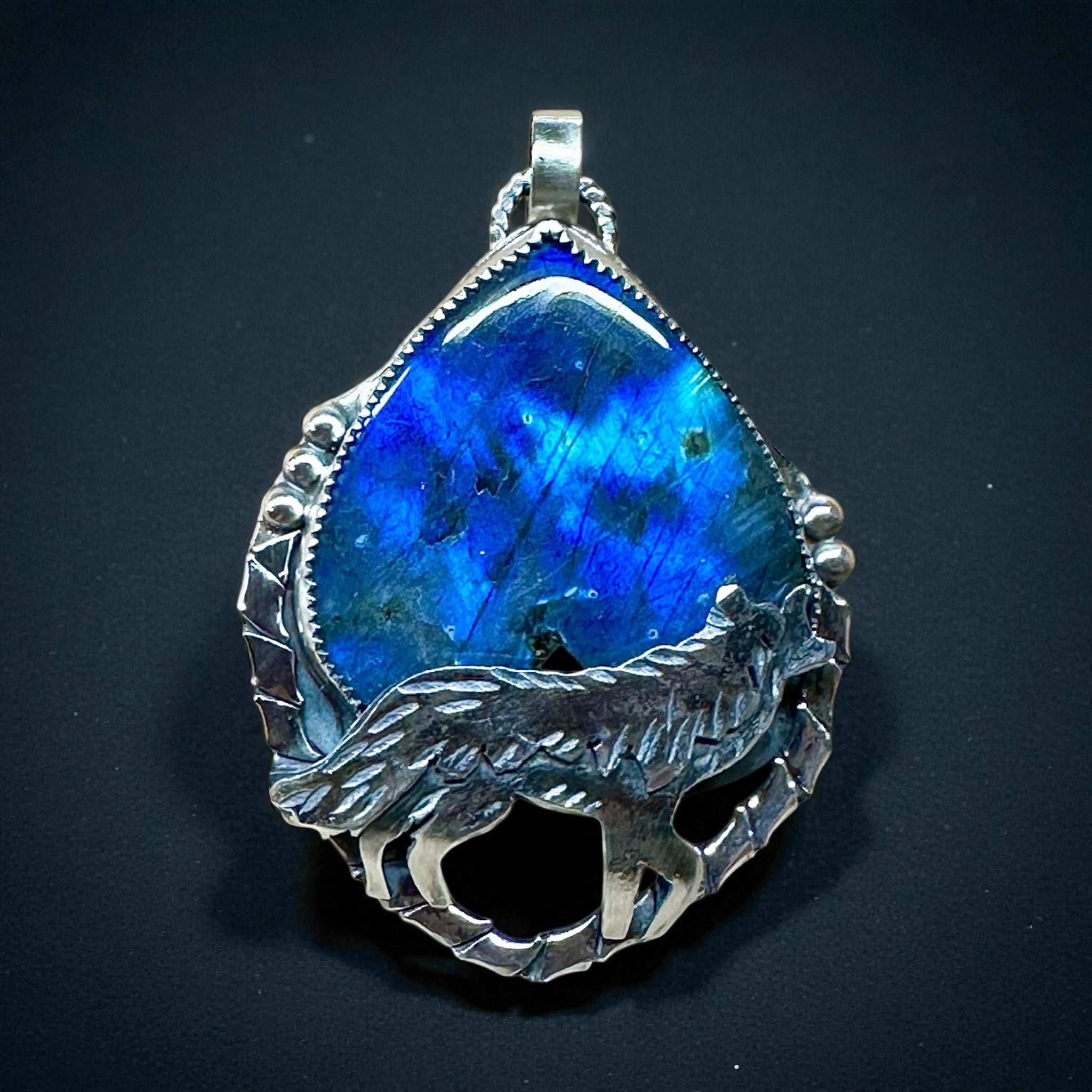 A one of a kind sterling and fine silver pendant featuring a high quality vibrant blue labradorite cabochon .  This beautiful cabochon reminded me of a night sky bursting with stars and cloudy creating shades of blue and black .  A hand forged sterling silver Wolf stands howling in the shadowy night sky.  The wolf stands against the cabochon creating volume and depth bringing the scene to life.  Backplate has a pierced heart revealing more of the beautiful color in the stone . Pendant measures 2 3/8” including the bail.  Visit our Instagram or Facebook page to see this quality stone in a video.  A special setting for an outstanding stone .