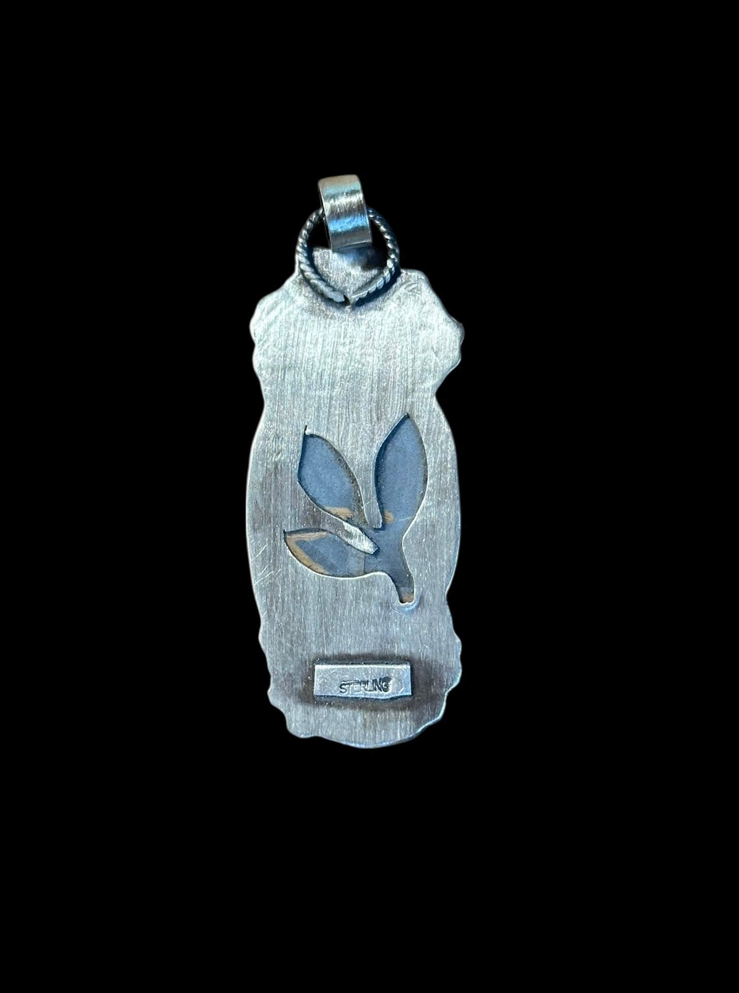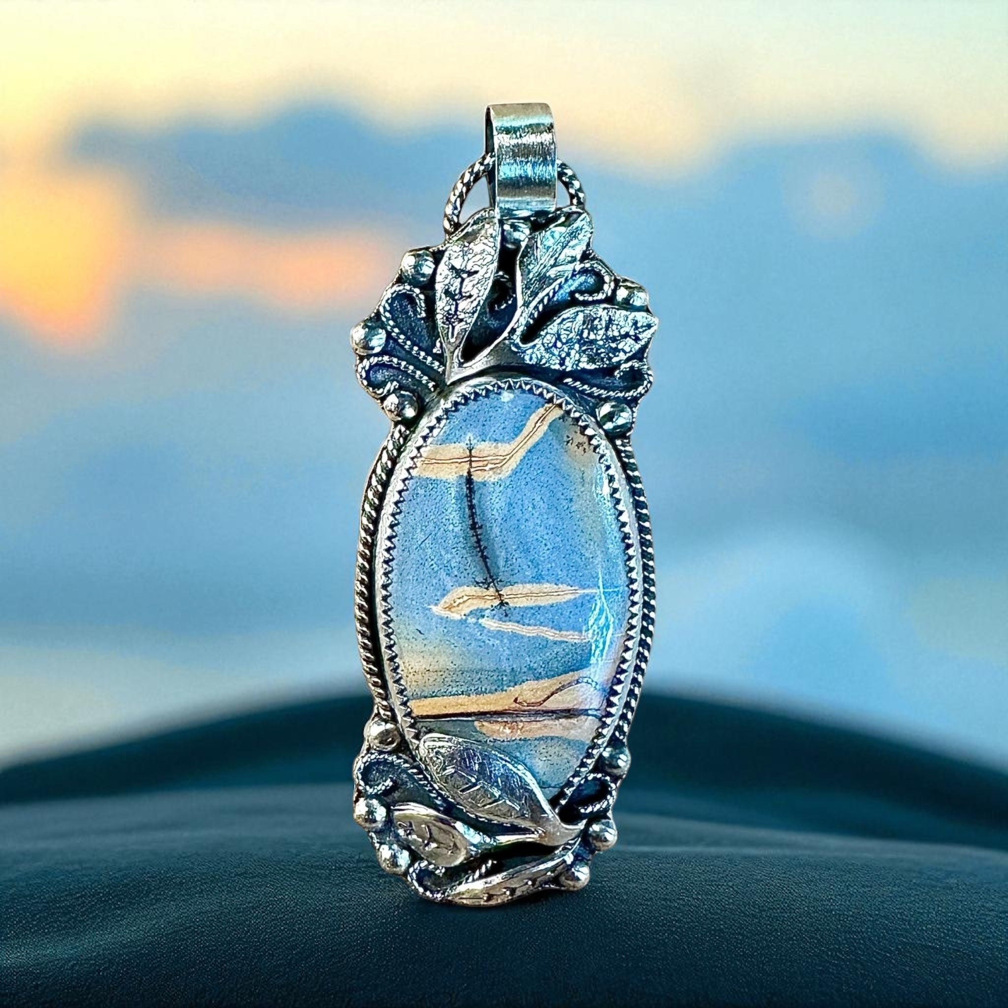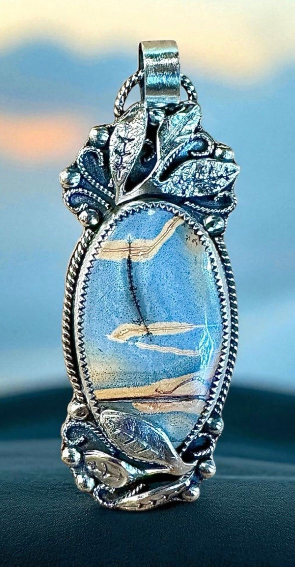 A unique Maligano cabochon cut by our lapidary artist Paul Rossman features an unusual color palette and interesting pattern . Set in sterling and fine silver this pendant measures 2 5/8” including the bail . In this nature inspired designed hand forged leaves wrap around the stone . A pierced back plate features a cluster of leaves adding more artisan detail . A one if a kind artisan pendant .