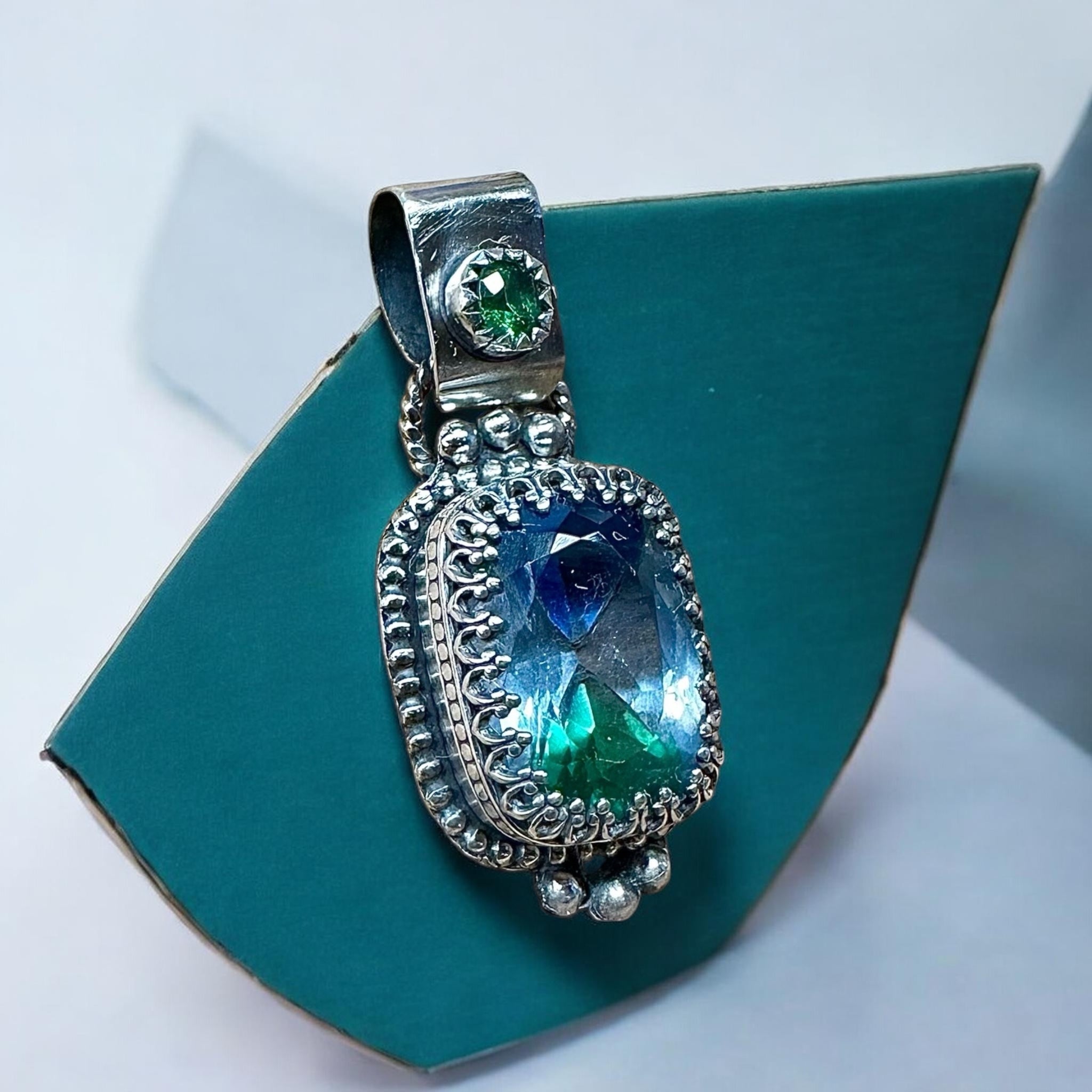 Pitambari Sapphires are a rare natural Sapphire that is bi or tri colored. These natural multi colored stones command a high price . Because of its rarity skilled lapidary artists have used their talents to create a Pitambari Sapphire by combining different colored natural Sapphires gemstones for gem collectors and jewelry lovers during the faceting process . By doing so jewelry lovers get to own a natural Sapphire multi colored created by a mosaic technique at an affordable price . This Patambari sapphire combines light blue, green and dark blue natural sapphire. Accented with a faceted Emerald this sterling and fine silver pendant measures 1 1/2” including the bail . A open backplate lets the light shine through. Visit our Facebook or Instagram page to see this pretty gemstone fin a video. A unique pendants
