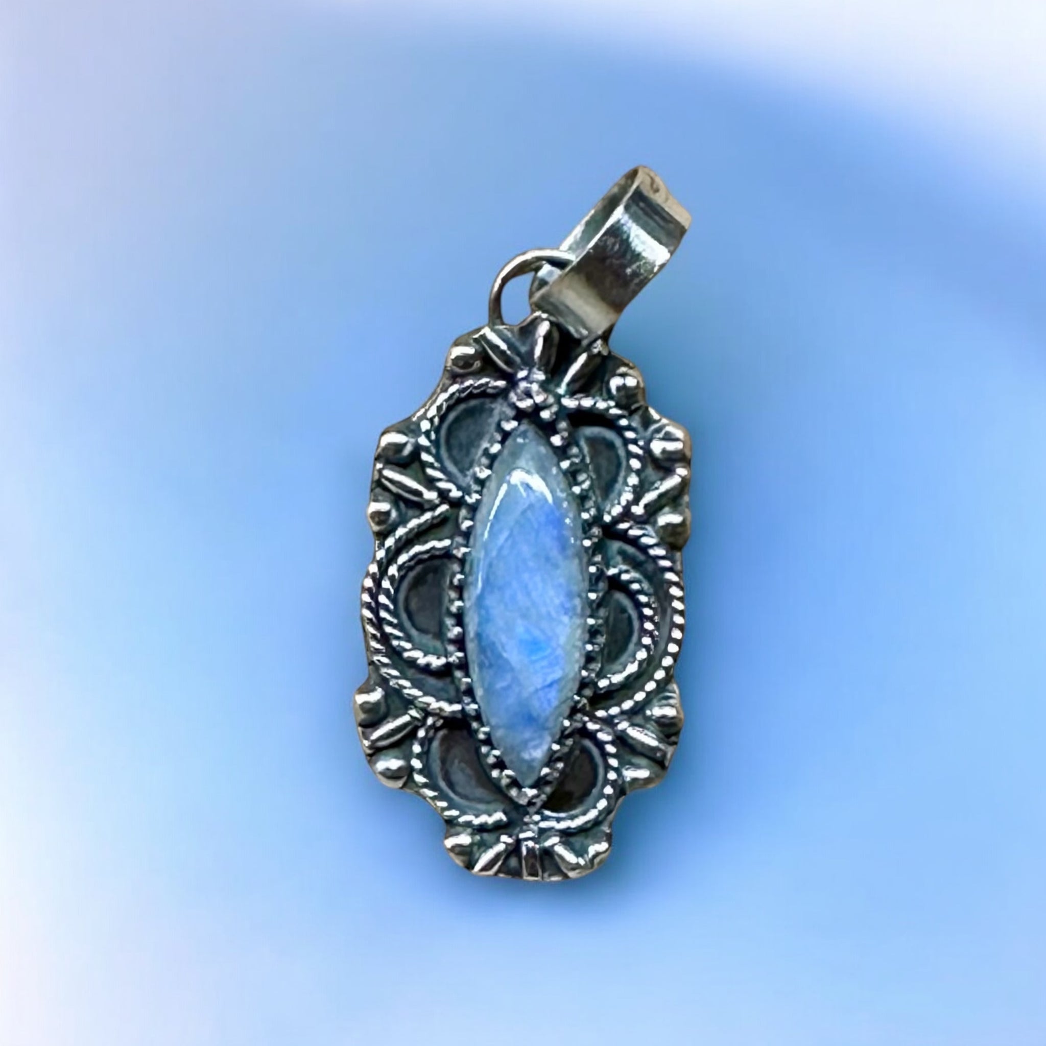 A small feminine sterling and fine silver pendant features a quality dark blue Rainbow Moonstone cabochon .  Beautiful natural moonstone is accented Repousse sterling silver flowers. A feminine artisan design this pendant measures 1 1/8” including the bail.   Visit our Facebook or Instagram page to see this pretty stone in a video