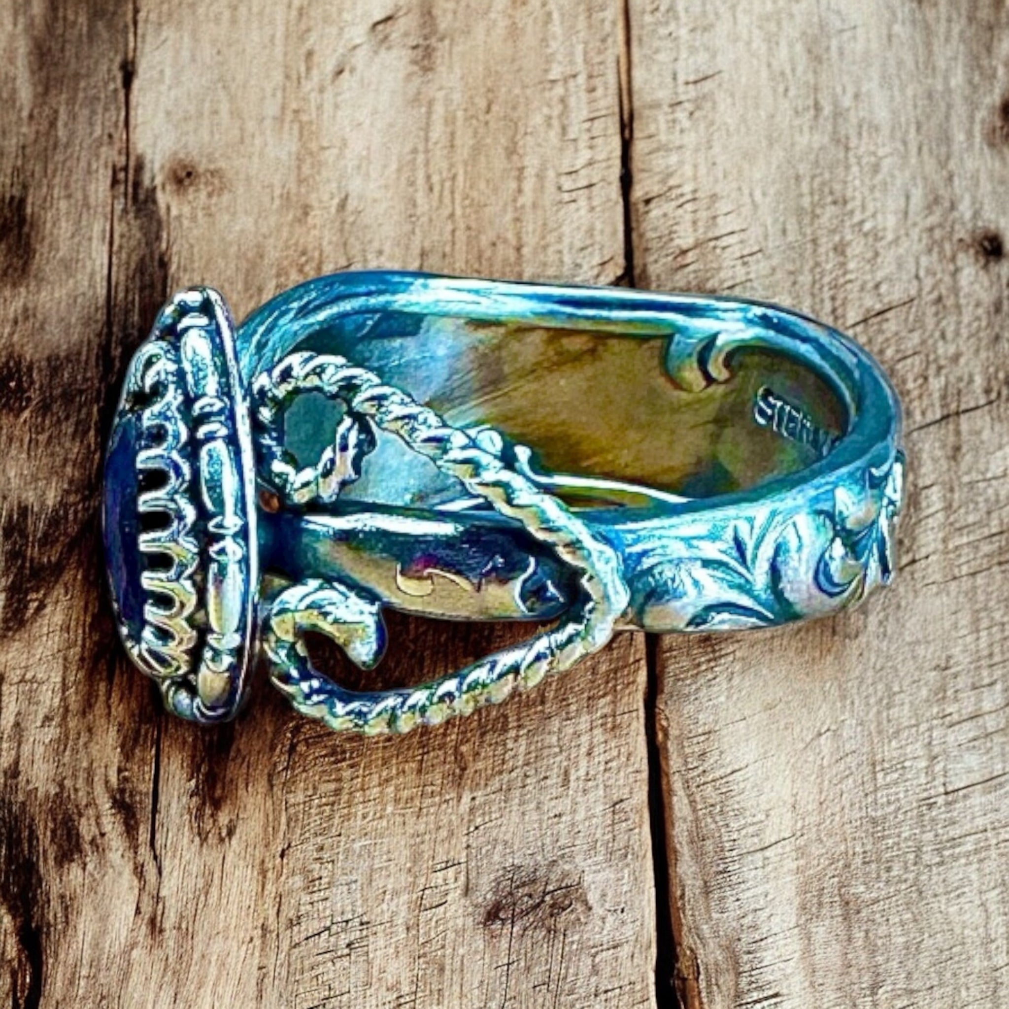 A unique sterling silver floral Repousse Sapphire ring SIZED TO ORDER for a perfect fit . This unique ring features a detailed floral repousse graduated band the has been transformed from a vintage Dominic and Haff sterling silver spoon from 1888. No longer hidden in a draw it’s has become an elegant band for a dark blue faceted Sapphire gemstone. Ring is SIZED TO ORDER for a perfect fit . Own a piece of history over 100 years old and a beautiful gemstone in a unique sterling silver ring . Visit our Instagram or Facebook page to see this beautiful ring in a video .