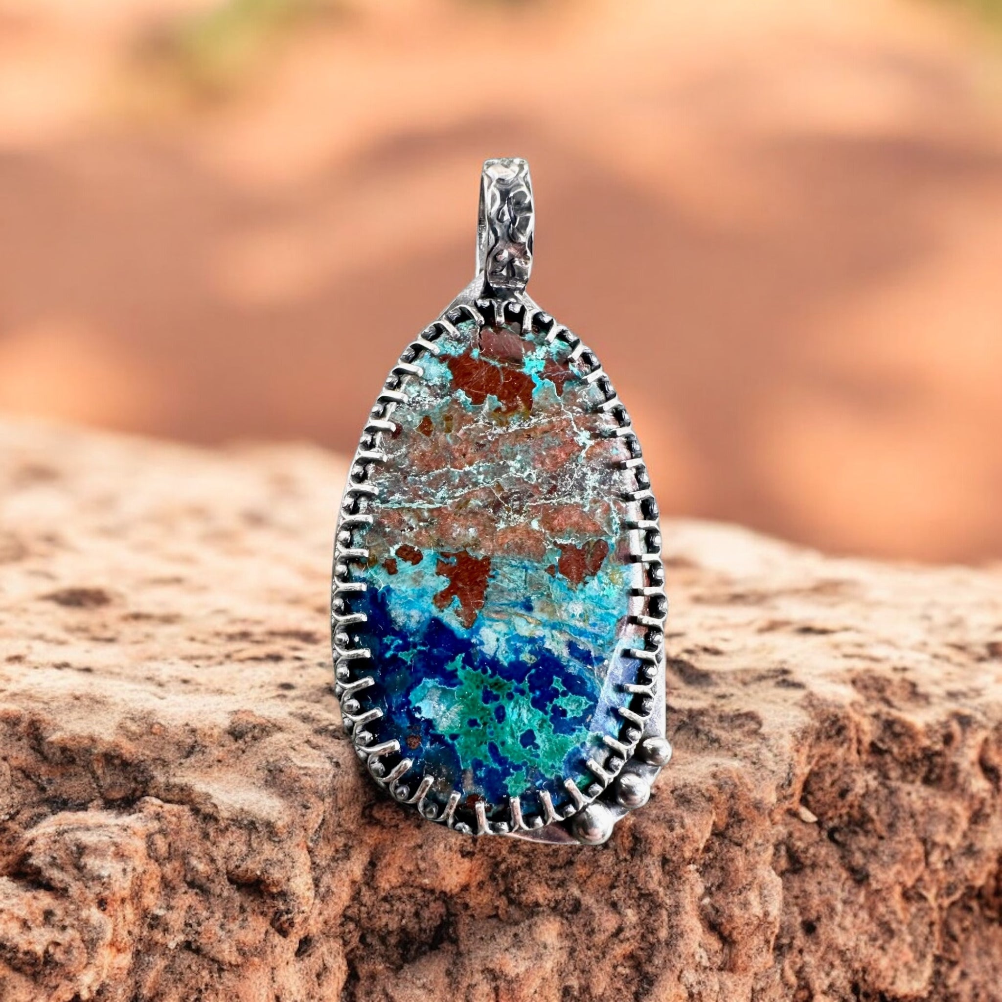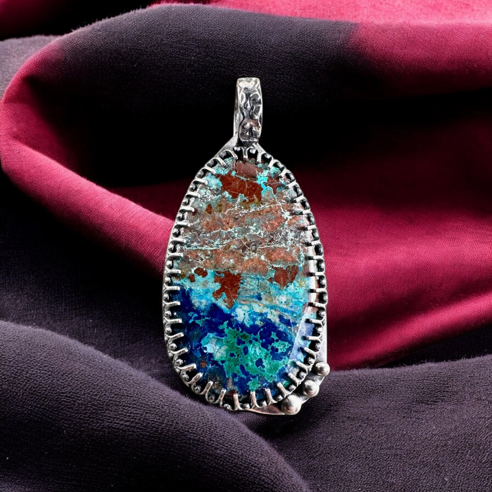 This beautiful Shattuckite cabochon cut by our lapidary artist Paul Rossman shows a range of blues from Chrysocolla to Turquoise, red from Cuprite , dark blue Azurite and Malachite inclusions. Mined in AZ and now other locations . Set in sterling and fine silver pendant measures 2” including the bail. Express your unique style by wearing one of a kind artisan designed gemstone jewelry.
