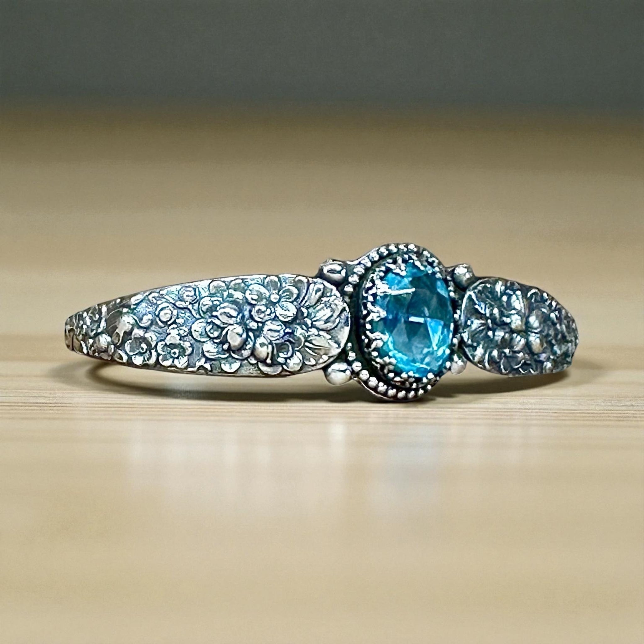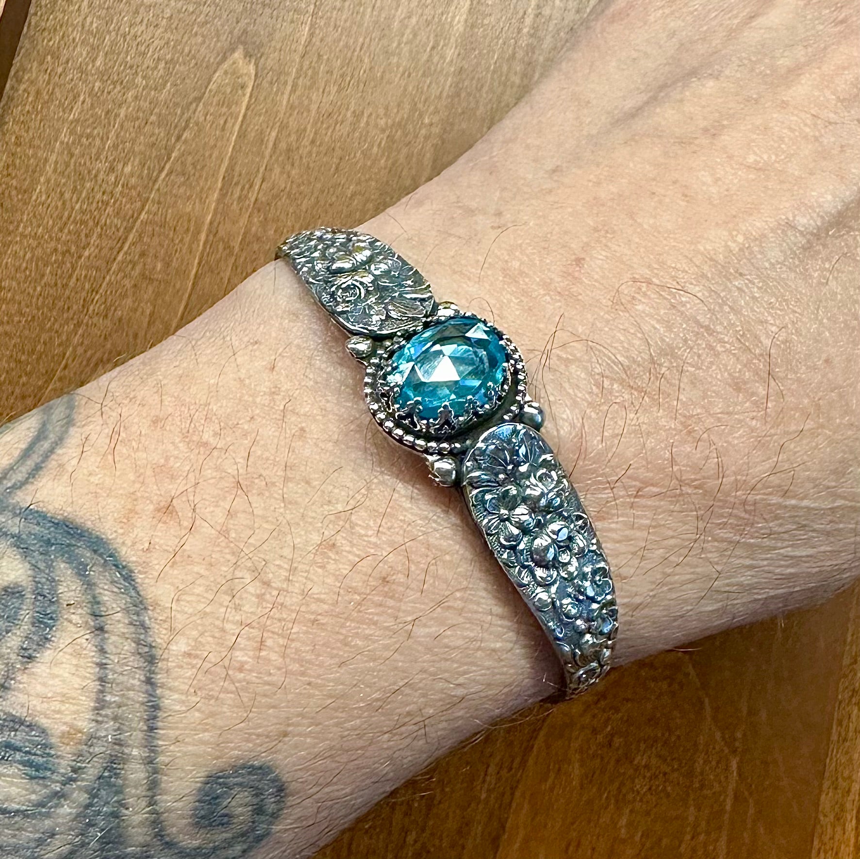 A very special heavy sterling silver cuff bracelet 💙 featuring a beautiful blue natural Zircon gemstone .  Beautiful color and an elegant setting featuring floral sterling silver Repousse band .  Easy on and off . Measures 6” and will fit most wrists . Will shorten for a petite wrist on request .  The raised floral band has incredible detail .  Visit our Instagram or Facebook page to see this beautiful cuff in a video . A heirloom quality piece  💙