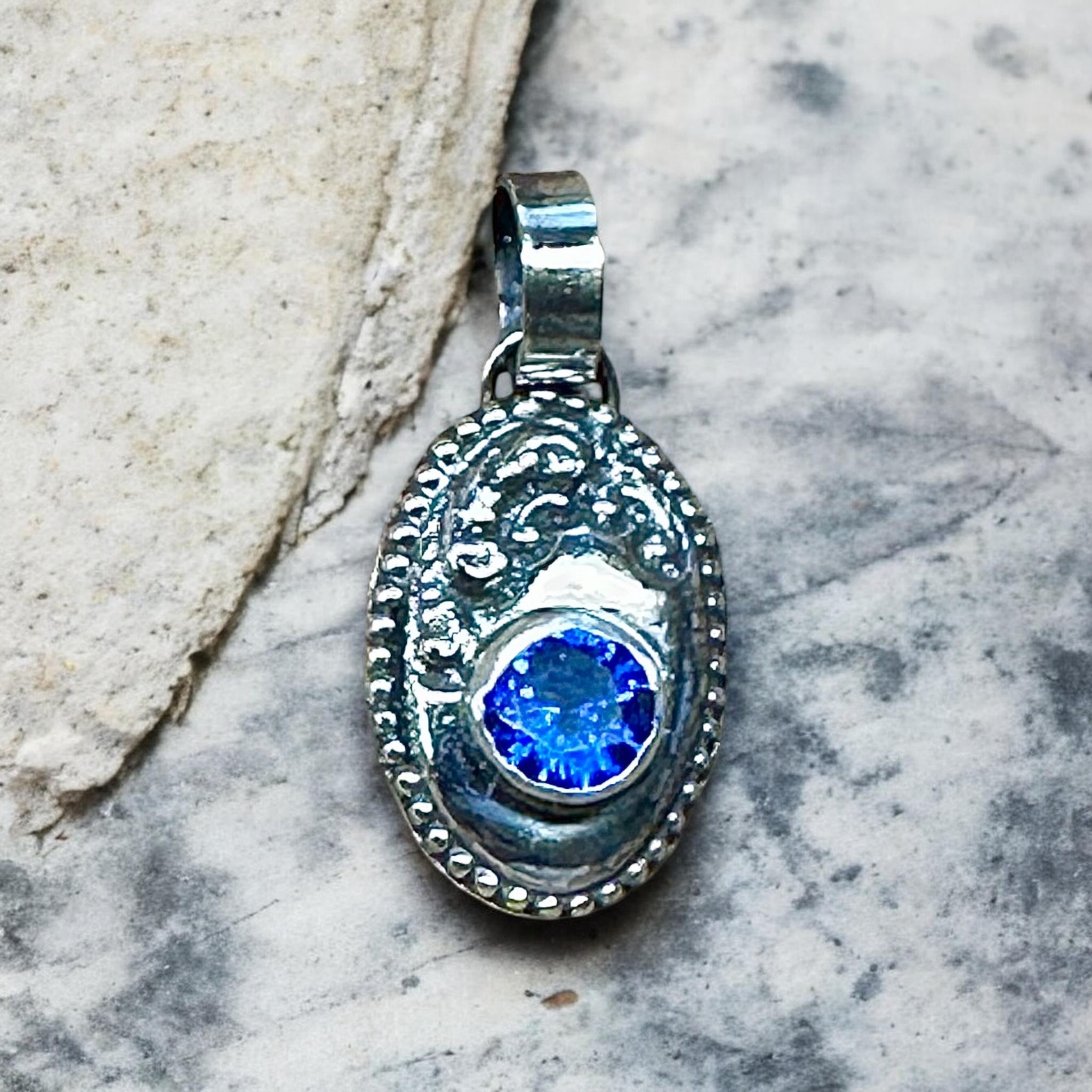 A very unique sterling and fine silver pendant featuring a faceted Ceylon Blue Sapphire gemstone . Beautiful blue earth mined stone that has been treated per industry standard for color and clarity . Creating a piece of jewelry with a visibly beautiful gemstone and more affordable than an untreated stone. A Repousse design on the silver showcases the beautiful stone. Pendant measures 1 1/8” including the bail. Visit our Facebook or Instagram page to see this special pendant in a video .