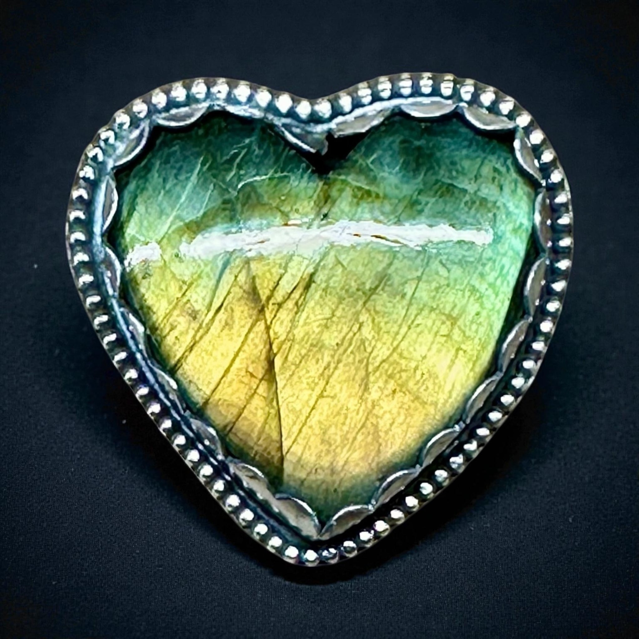 A quality golden and blue Labradorite Heart sterling and fine silver ring .  RING IS SIZED TO ORDER for a perfect fit . This large statement ring exhibits beautiful flash.  Visit our Instagram or Facebook page to see a video of this beautiful statement ring.