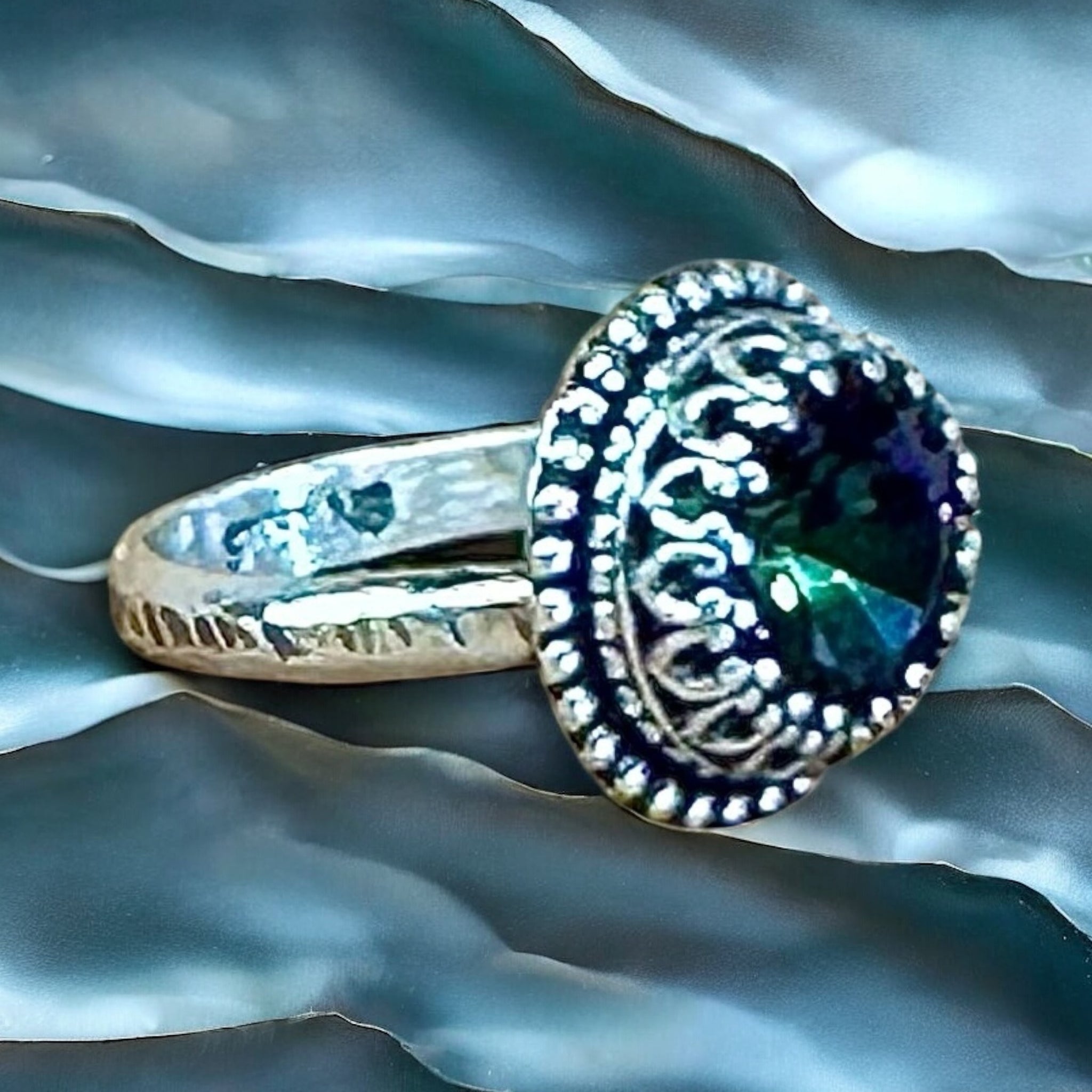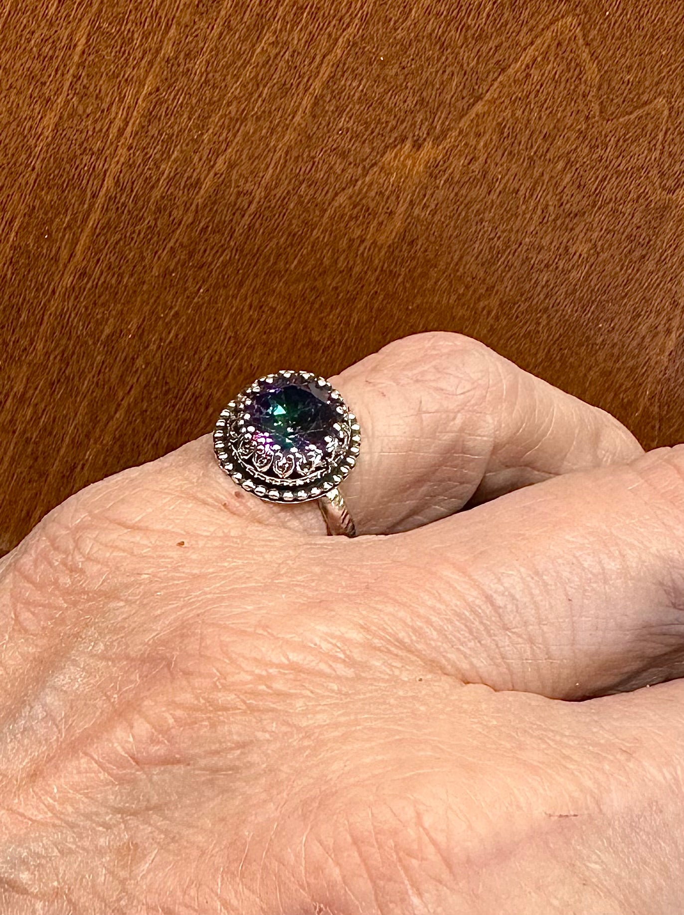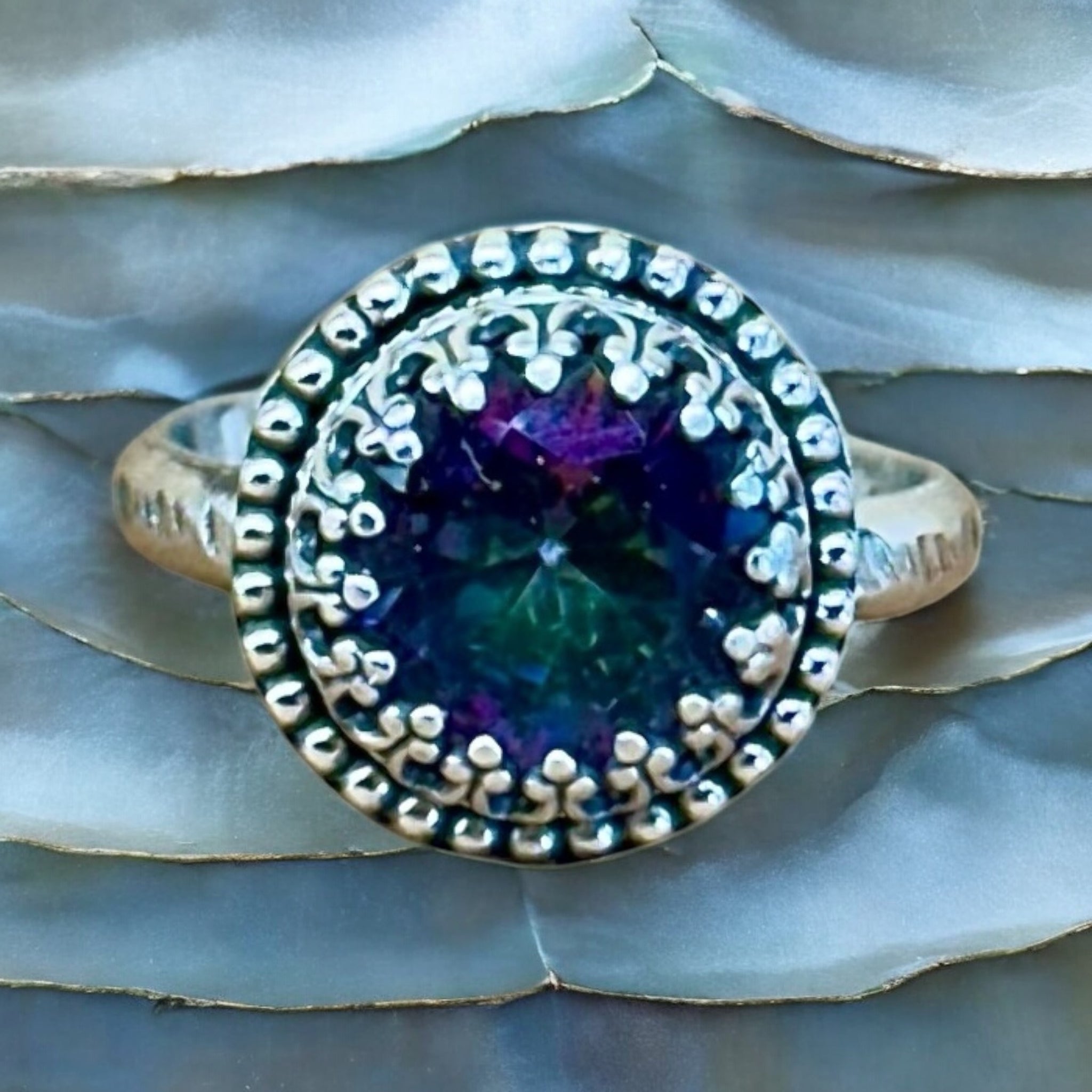 A beautiful 10mm brilliant cut Mystic Topaz gemstone is set in sterling and fine silver. Deep black base color with multi color sparkles make this stone a favorite . A unique artisan setting showcases the stone . Sized to order for a perfect fit . Please include your ring size when ordering. Visit our Instagram or Facebook page to see this beautiful stone in a video . Even prettier in person .