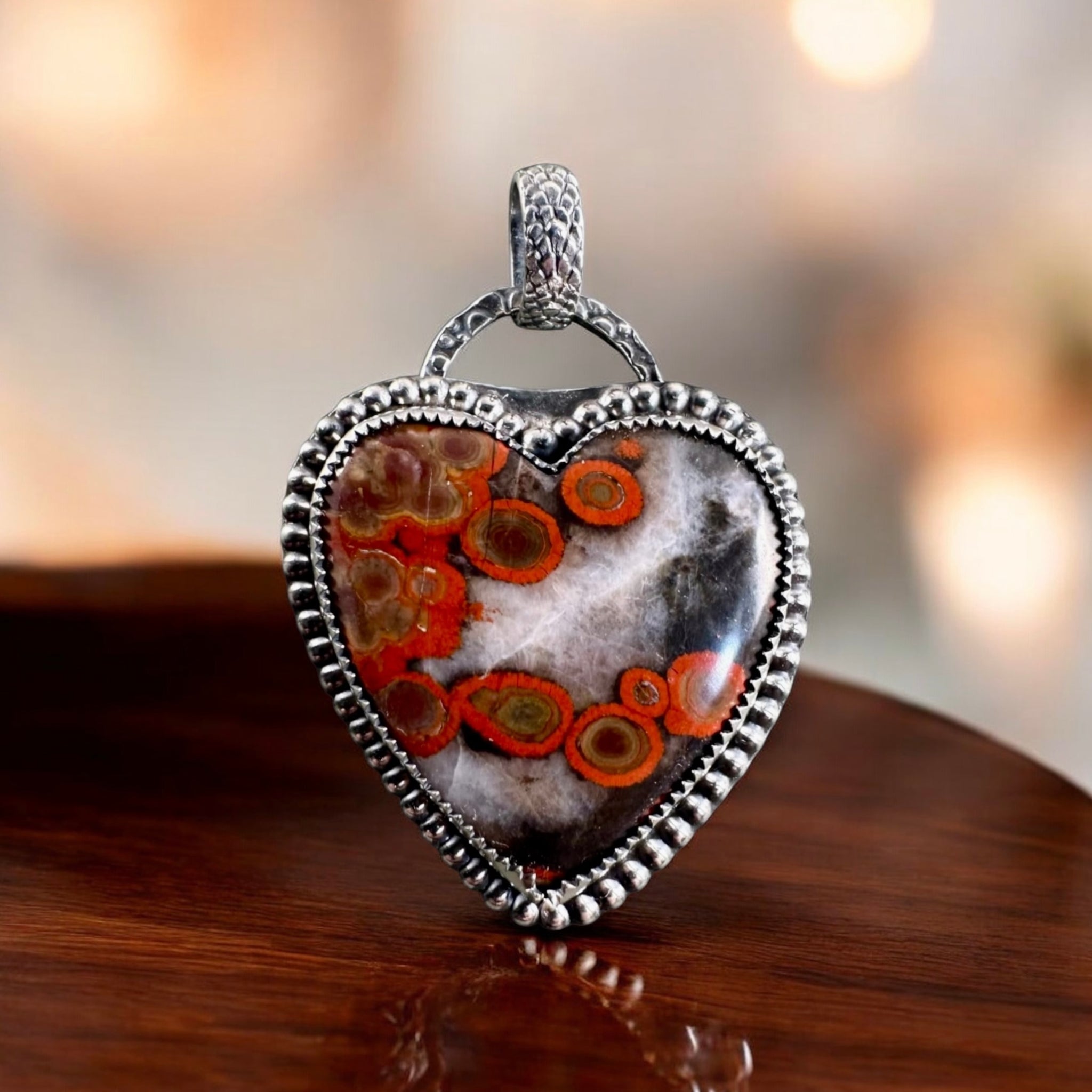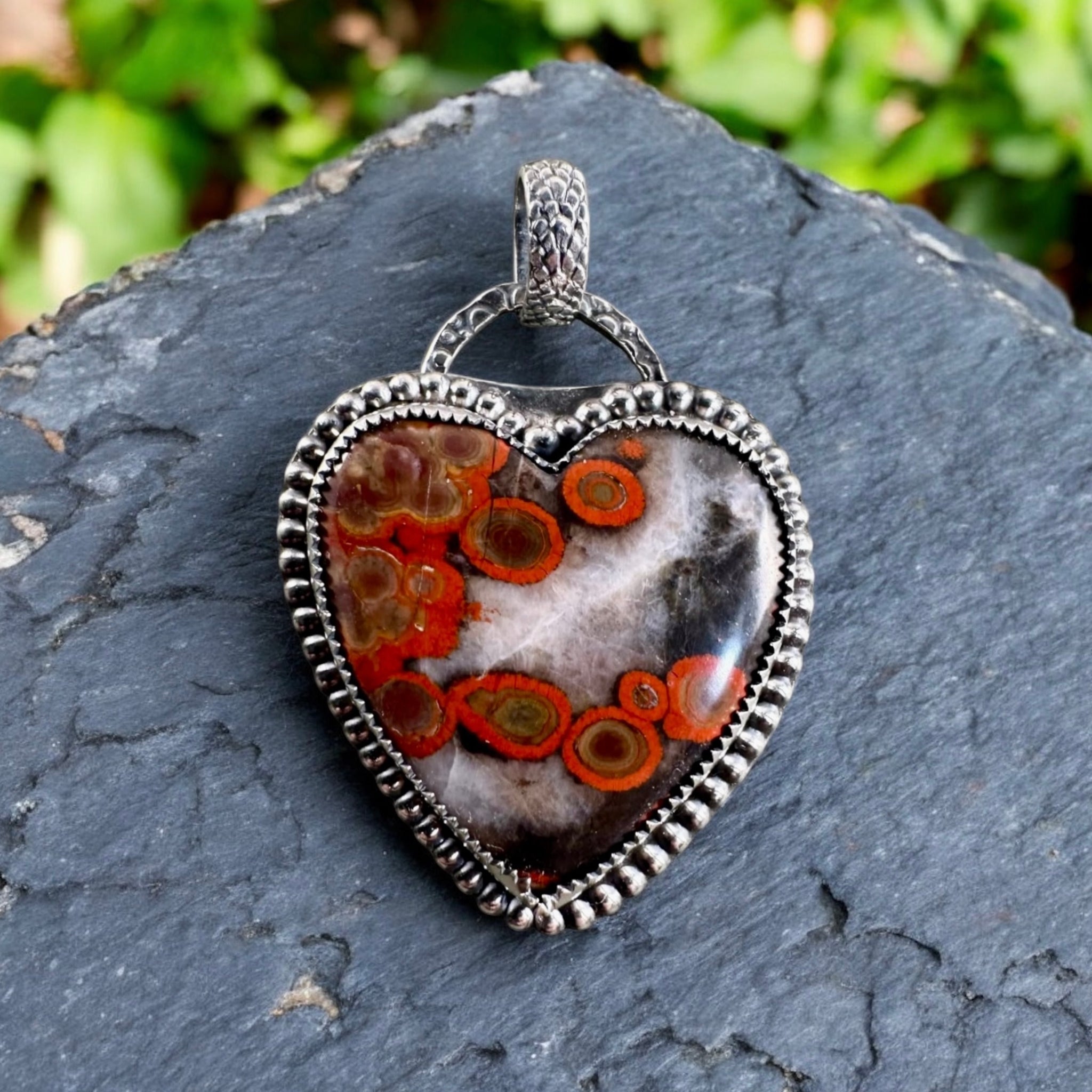 A beautiful Morgan Hill, Poppy Jasper heart cabochon cut by Paul Rossman. Set in Sterling and fine silver this stone shows beautiful color and pattern. Mined in Santa Clara County, El Toro Mountain area, California. Pendant measures 2 inches including the Bail. Express your own unique style by wearing artisan jewelry with collectible gemstones.