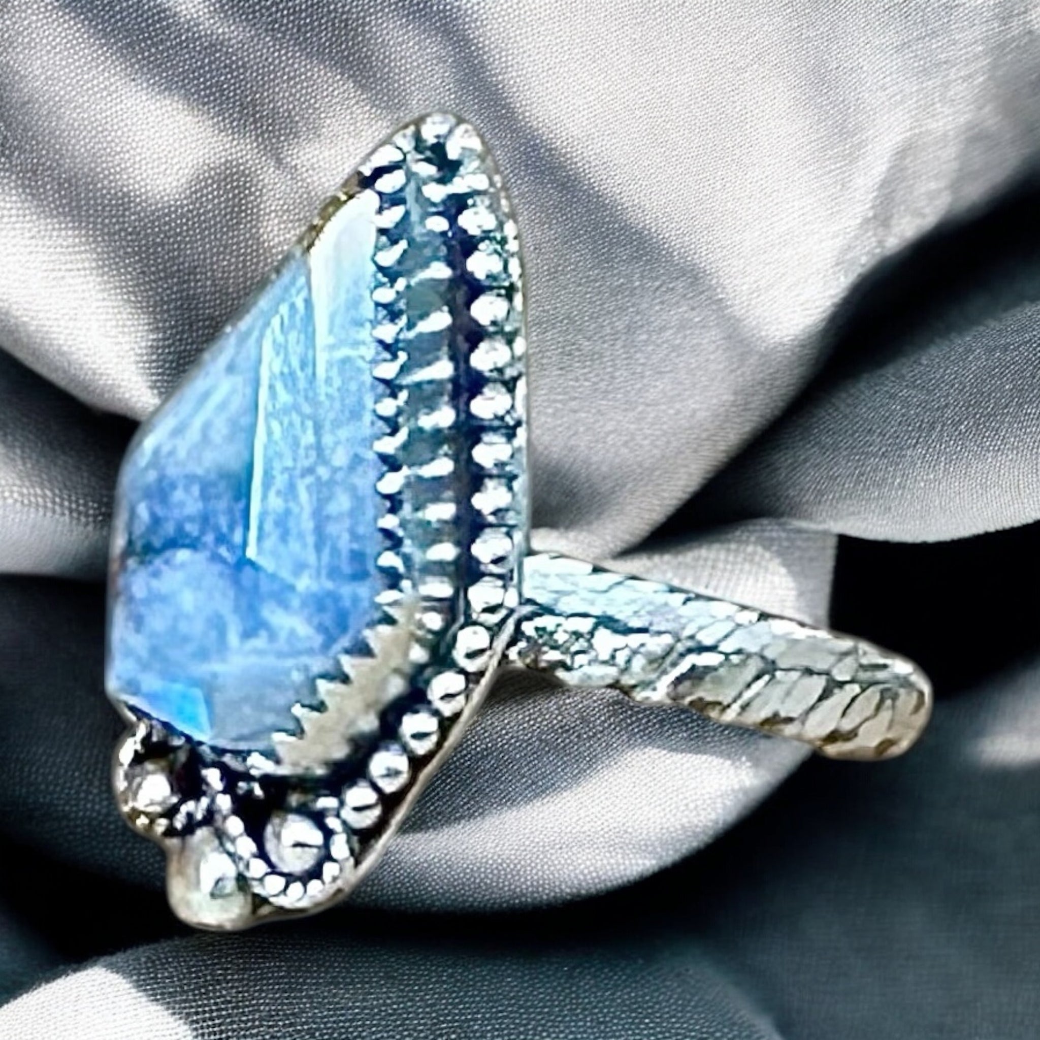 On high quality faceted Rainbow Moonstone is featured in this sterling and fine silver ring   SIZED TO ORDER for a perfect fit .  Visit our Instagram or Facebook page to see this beautiful stone in a video .  Remember to include your ring size when ordering .
